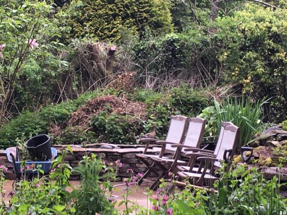 As mentioned in previous blogs, we have a large natural pond in the lower part of our field. What I haven’t told you is that we also have a large pond at the top of our field (at the end of our garden) which Malcolm created quite a few years ago. The pond itself is very pretty, but below it was a very scruffy corner of the garden with several up turned fibreglass pond liners, a part built wall, various bits of debris and all of it overgrown with nettles and weeds. This was the start of a project which was always intended to be finished, but there was just never time. For us, the silver lining to this dreadful Coronavirus pandemic and lockdown, has been that Malcolm, ably assisted by son James, has been able to set to work to finish it.